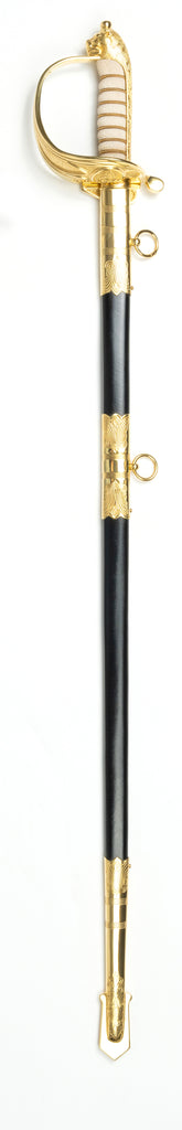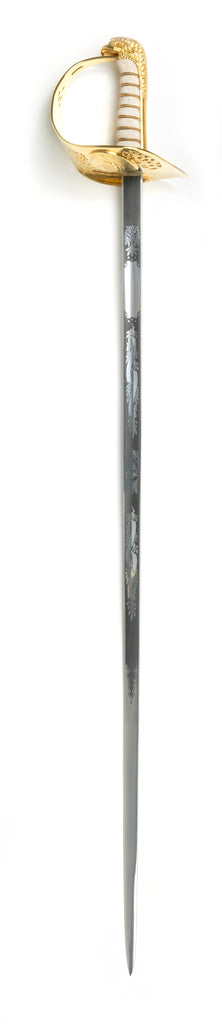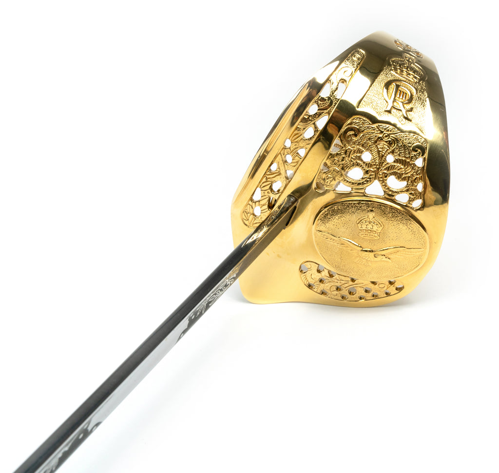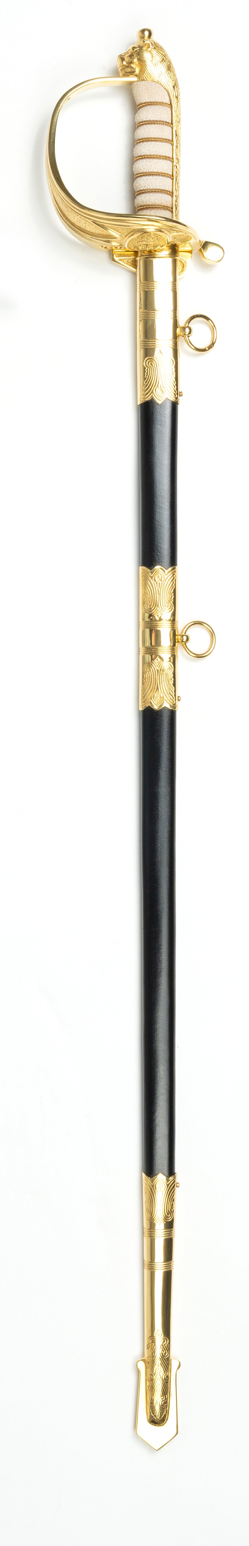 Weight – 920g Scabbard – 3mm Real rawhide leather scabbard, hand-sewn with gold plated brass mountings with 2 attachments.